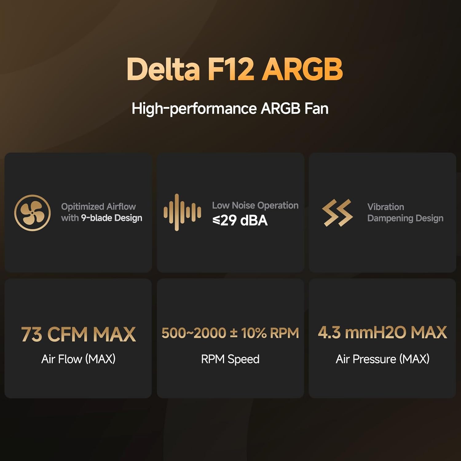 【Exquisite Circular Aesthetics】Delta F12 ARGB case fan incorporating the Infinite design language, featuring the iconic gold ring with dual brushed textures, offering a delicate and textured feel